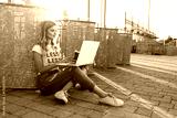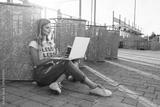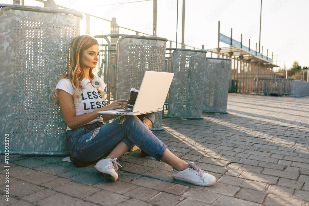 Young woman in white T-shirt with word "less" working for laptop and drinking coffee