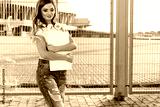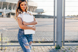 Portrait of a smiling young woman in white T-shirt with word "less" standing with laptop. Image with copy space