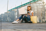 Young woman in white T-shirt with word "less" working for laptop and drinking coffee