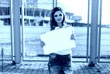 Young woman in white T-shirt with word "less" working for laptop and drinking coffee