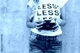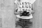 Stylish woman photographer in white T-shirt with word "less" with retro camera on the gray wall background