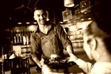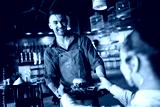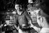 Casual dining lifestyle, waiter serves a delicious burger and fries in a relaxed restaurant setting