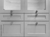 Symmetrical mint cabinetry with multiple brass knobs and fluted glass panels, balanced design, framed shaker doors, serene pastel palette delivering timeless interior storage aesthetic