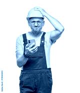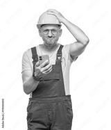Mistake. Panicked middle-aged construction worker with the mobile phone in the trouble, isolated on white background. Impatient repairman holding the phone. Craftsman against white wall