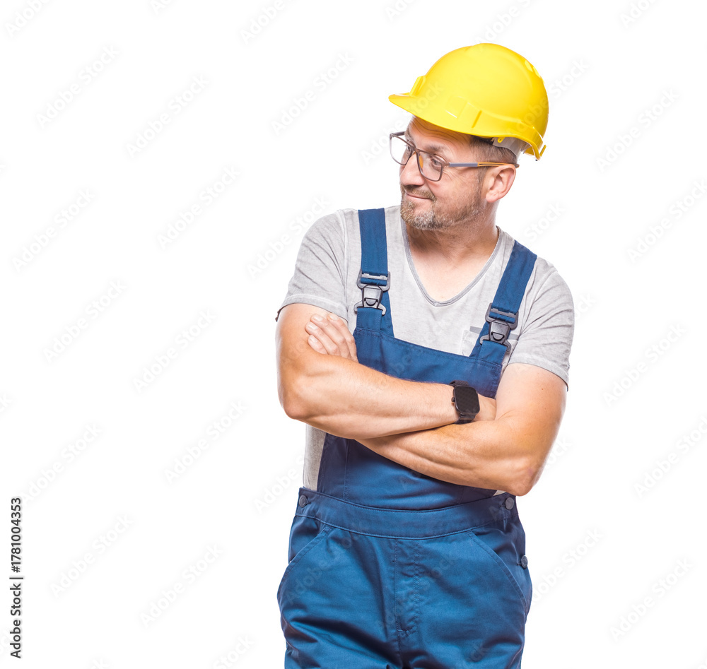 Annoyed middle-aged construction worker, isolated on white background. Displeased repairman with arms crossed. Copy space. Craftsman against white wall