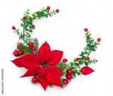 Christmas decoration with red poinsettia flowers, red berries and fir branches on a white background with copy space. Top view, flat lay