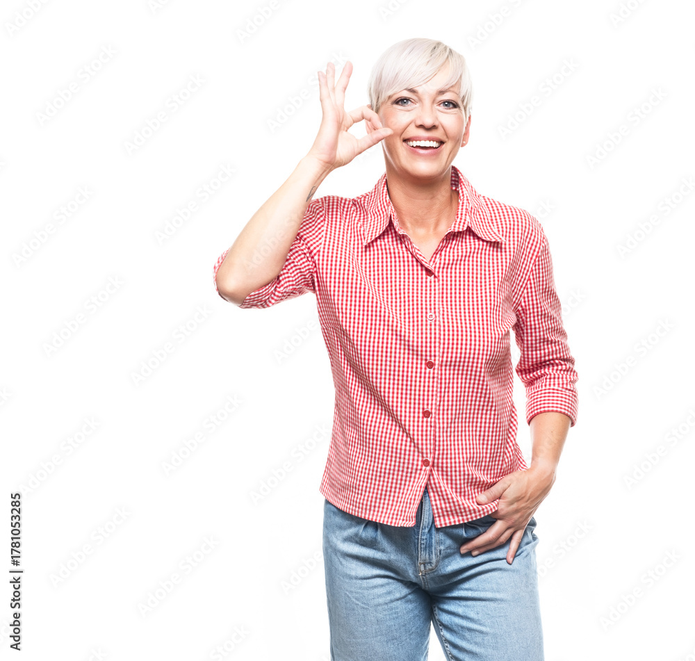 Surprised adult woman shows excellent sign with finger, isolated on white background. Yes or excellent gesturing, body language concept.