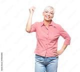 Adult woman snapping fingers, isolated on white background. One pretty middle aged woman gesturing click.