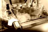 Hot steaming ramen noodle cooking with stainless kitchen equipment