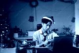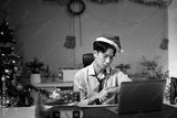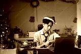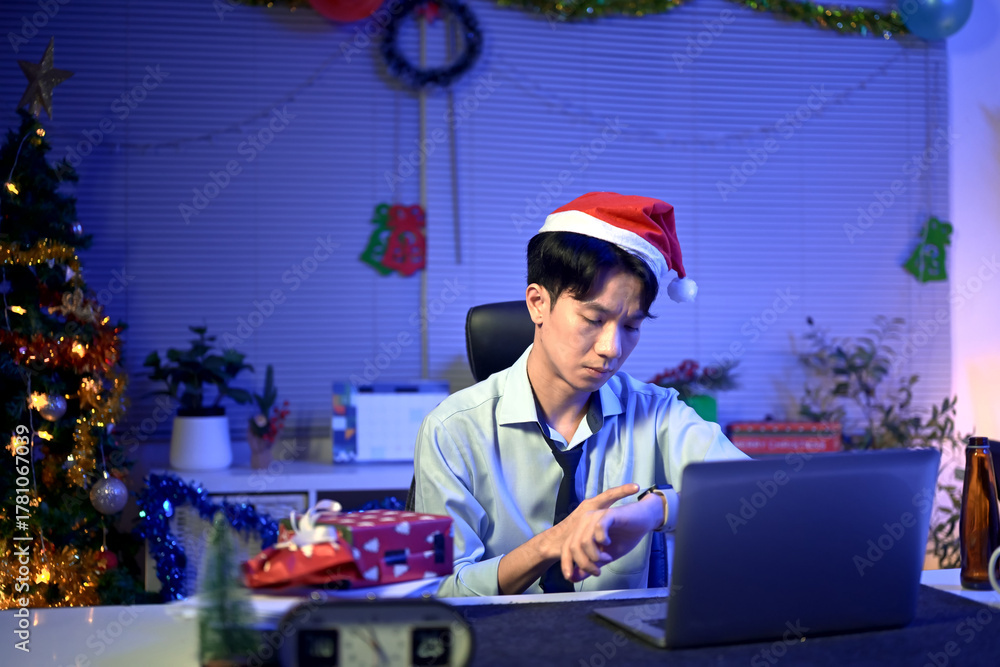 Businessman in Santa hat working late at Christmas day in office with Christmas decor