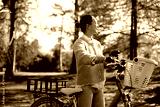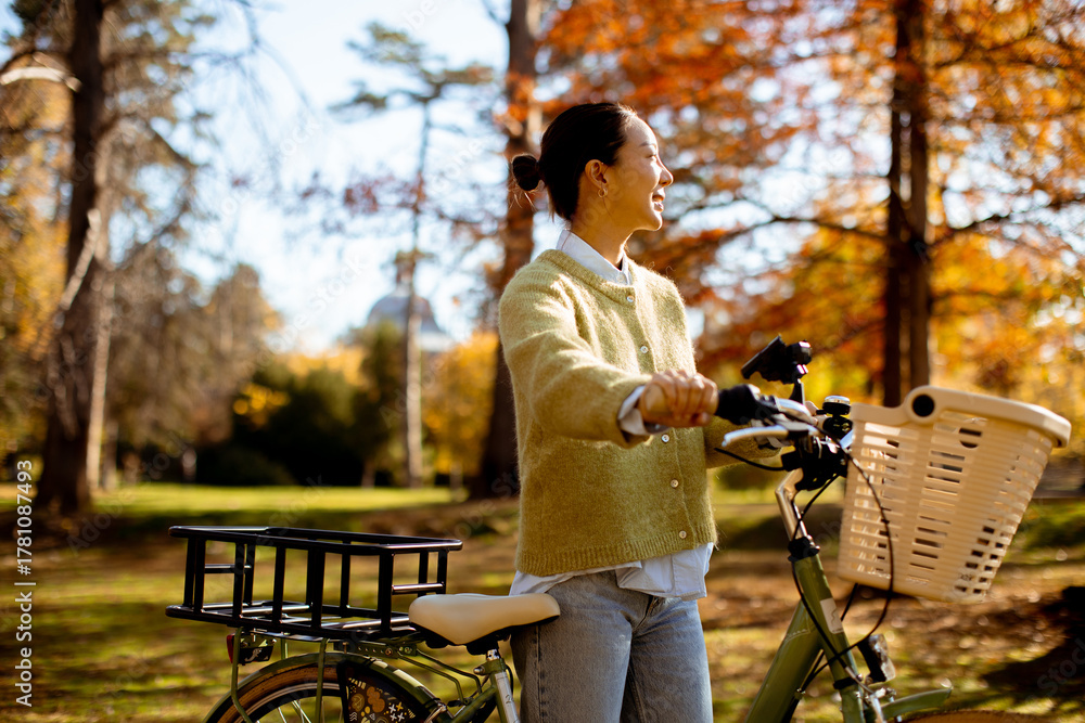 Joyful young woman enjoys autumn day in the park with a bicycle nearby