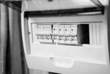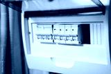 This is a detailed closeup view of an electrical circuit breaker panel that features multiple switches, commonly found in modern homes, showcasing its intricate design and functionality