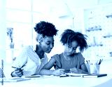 Mother and daughter doing homework at home. Mom and teenage black girl happy writing. Teen girl and parent sitting at home working at the table