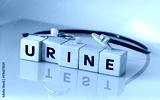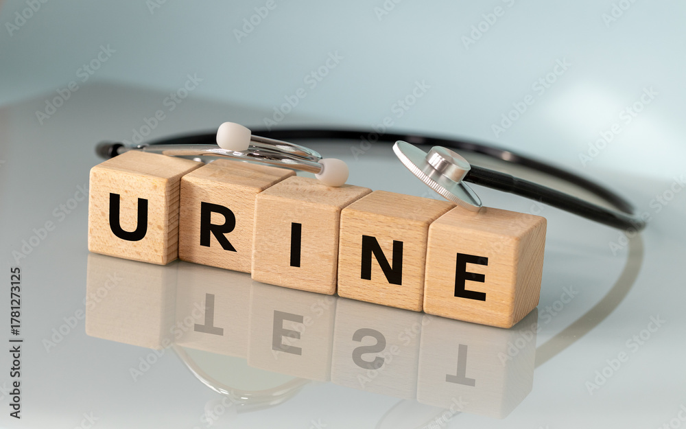 Urine test. Health concept. Laboratory tests. Written on wooden blocks Urine test. Light background, stethoscope