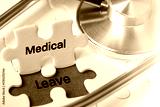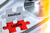 Medical leave. The concept of health. The phrase "Medical leave" is written on the jigsaw pieces next to a stethoscope. Breaks from work, illness, treatment. close up