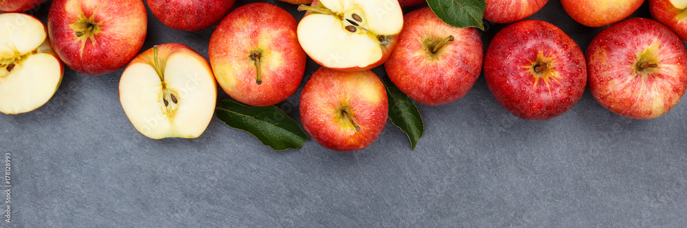 Äpfel Apfel rot Obst Schiefertafel Frucht Textfreiraum Banner Copyspace Früchte von oben