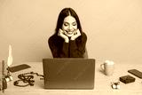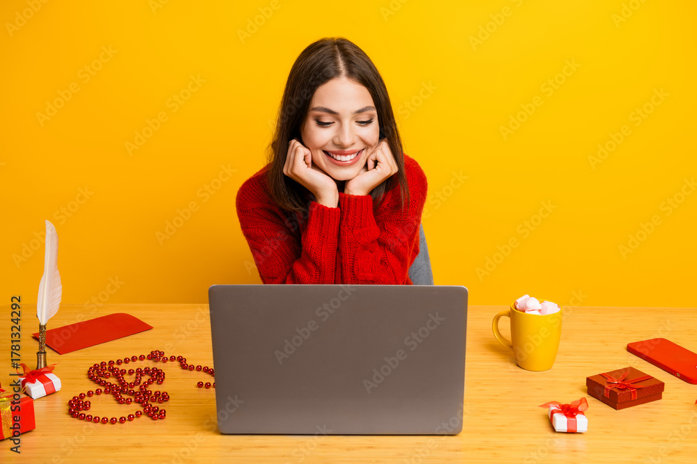 Funny cozy Christmas vibe girl with laptop at festive desk bright yellow background surrounded by gifts mug and decorations