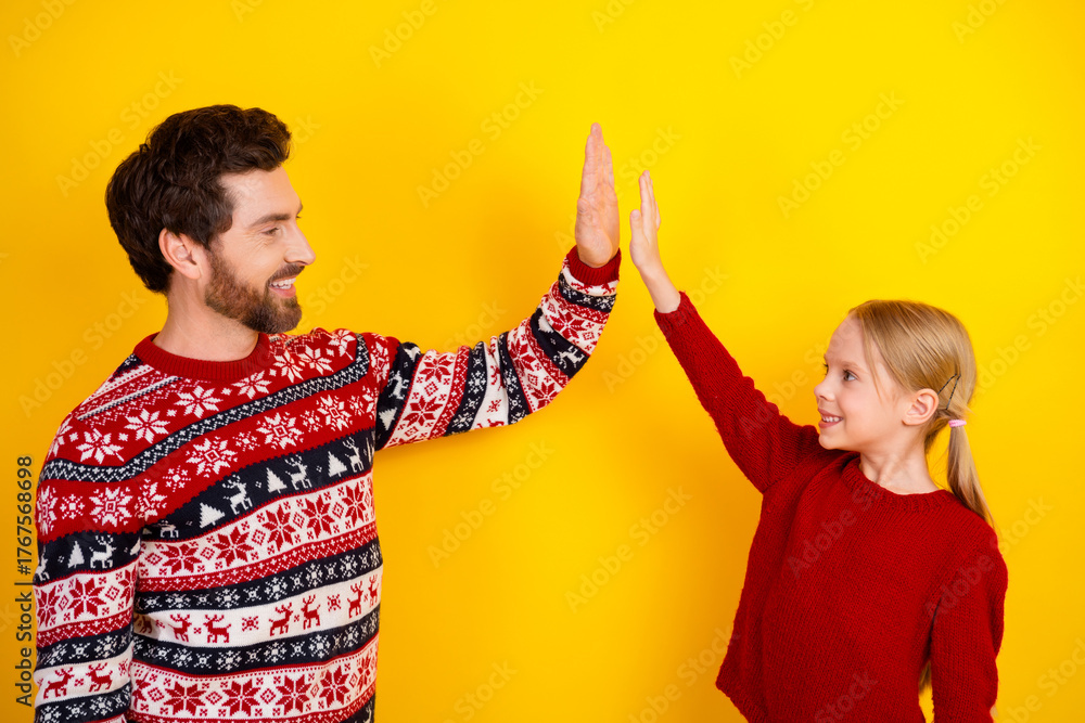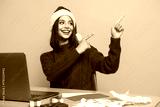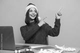 Funny Santa workshop moment with a young pretty woman in a red sweater at a bright desk sharing holiday cheer