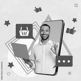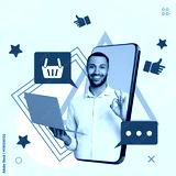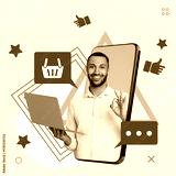 Content manager, creative collage. Man with laptop in screen of big mobile phone on beige background. Different icons around him