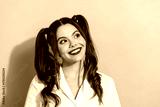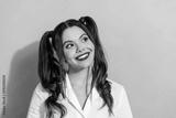Young woman with a bright smile wearing a white shirt posed against pink background