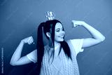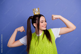 Young woman in a bright green knitted vest and white shirt poses confidently with a gold crown against a blue background empowering energy