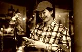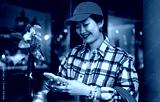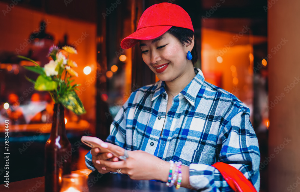 Smiling woman in red cap looks down at smartphone with calm delight, enjoying private digital moment, highlighting warmth, connection, and balance in independent tech lifestyle.