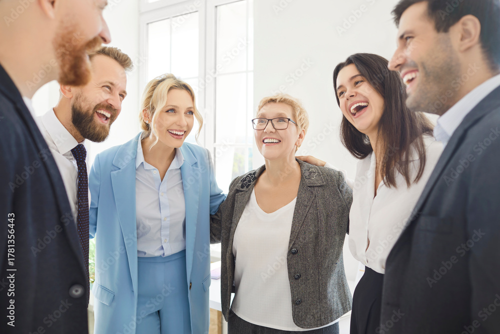 Diverse common happy people group teambuilding gathered in circle hug at workplace office, share, psychological support, helping, plan strategy, interacting with sympathy on psychotherapy training