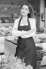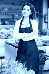 Portrait of smiling seller girl standing behind showcase in a vegetable shop