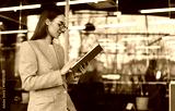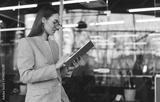 Young businesswoman in blue blazer uses digital tablet in office, representing fluid multitasking, modern autonomy and seamless engagement with smart technology.