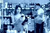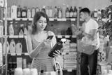 Girl buyer scans qr code on tile cleaner spay label, uses link to get additional information on Internet. Customer photographs product, searches for photo on Internet, man shopping in background
