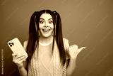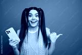 Excited young woman with yellow smartphone wears bright green knit vest against blue background