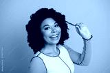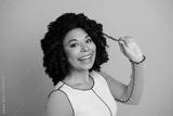 Cheerful lady with playful hairstyle curling hair strand against vibrant yellow background wearing trendy casual attire