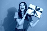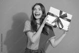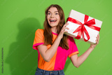 Young woman with gift box smiles wide wearing bright pink and orange shirt against green background promoting joy and gifting moment