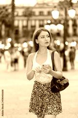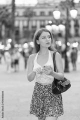Young woman looks around while walking on Royal Square (Placa Real) in Barcelona