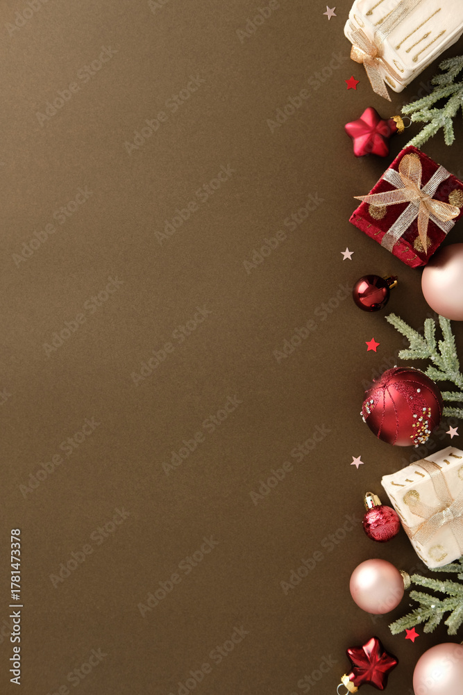 Christmas arrangement with gift boxes, ornaments and pine branches on right side of brown background, leaving empty space for seasonal text or design.