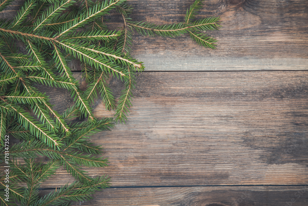 Christmas fir tree on a dark wooden board. Christmas or new year frame for your project with copy space.