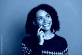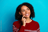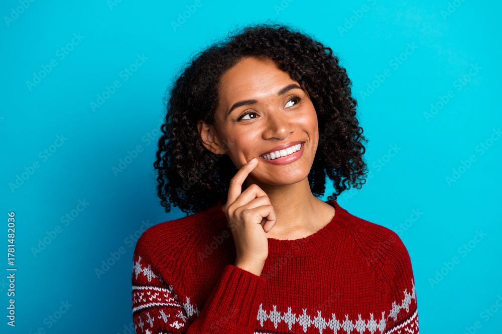 Playful young woman in a cozy red knit sweater smiles against a vibrant blue backdrop imagining holiday joy and merry celebrations with friends and family