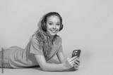 Smiling young woman wearing headphones and using a smartphone on a beige background