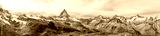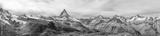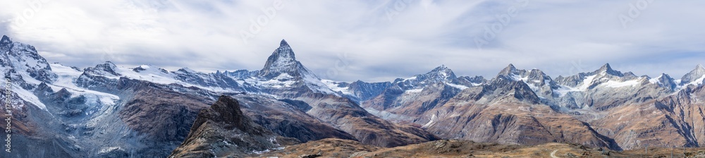 high resolution Panorama view from Gorner Grad on the surrounding mountains and glaciers, with visible Monte Rosa hut, Zermatt, Switzerland