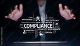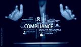 A pair of hands reaches out towards floating words representing compliance, quality assurance, and regulatory frameworks, set against a dark backdrop, emphasizing business integrity. Tessel