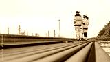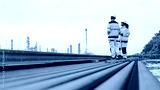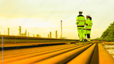 Energy professionals plan for the future at an industrial site. The team monitors operations at sunset, symbolizing sustainable growth and global infrastructure development.