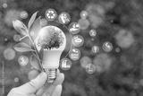 Hand holding LED light bulb with tree and green icons representing eco energy and sustainability