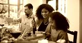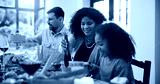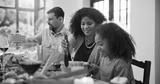 Thanksgiving, help and serve with family in dining room for holiday season, eating or tradition. Festive feast, party and event with parents and child in home for food, hosting and hospitality
