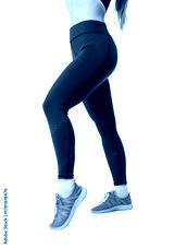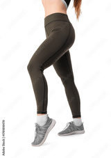 Sporty young woman in leggings on white background