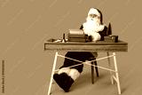 Santa Claus with vintage typewriter, envelopes, gift box, candy canes and jingle bell at table on brown background