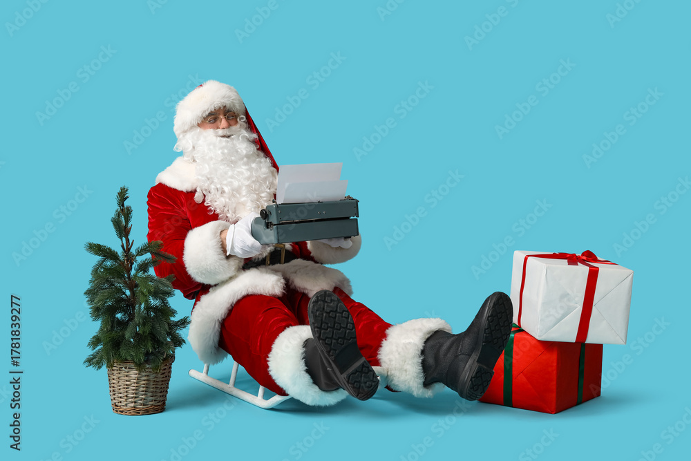 Santa Claus with vintage typewriter and Christmas tree sitting on sledge against blue background