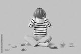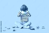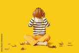 Beautiful young African-American woman in stylish outfit with autumn leaves and pumpkin sitting on yellow background