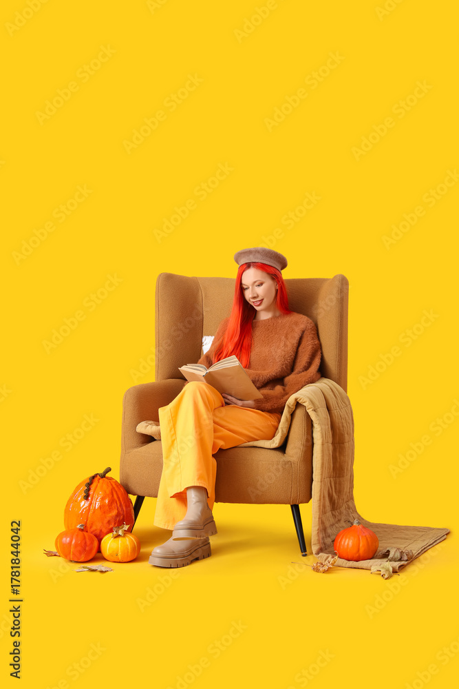 Beautiful young happy woman with pumpkins and autumn leaves reading book on armchair against yellow background