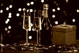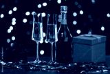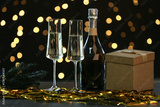 Bottle of champagne with glasses, Christmas tree branches, gift box and serpentine on table against blurred lights