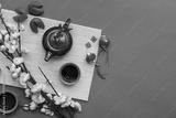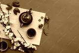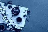 Tea with fortune cookies, sakura and Chinese symbols on blue background. New Year celebration